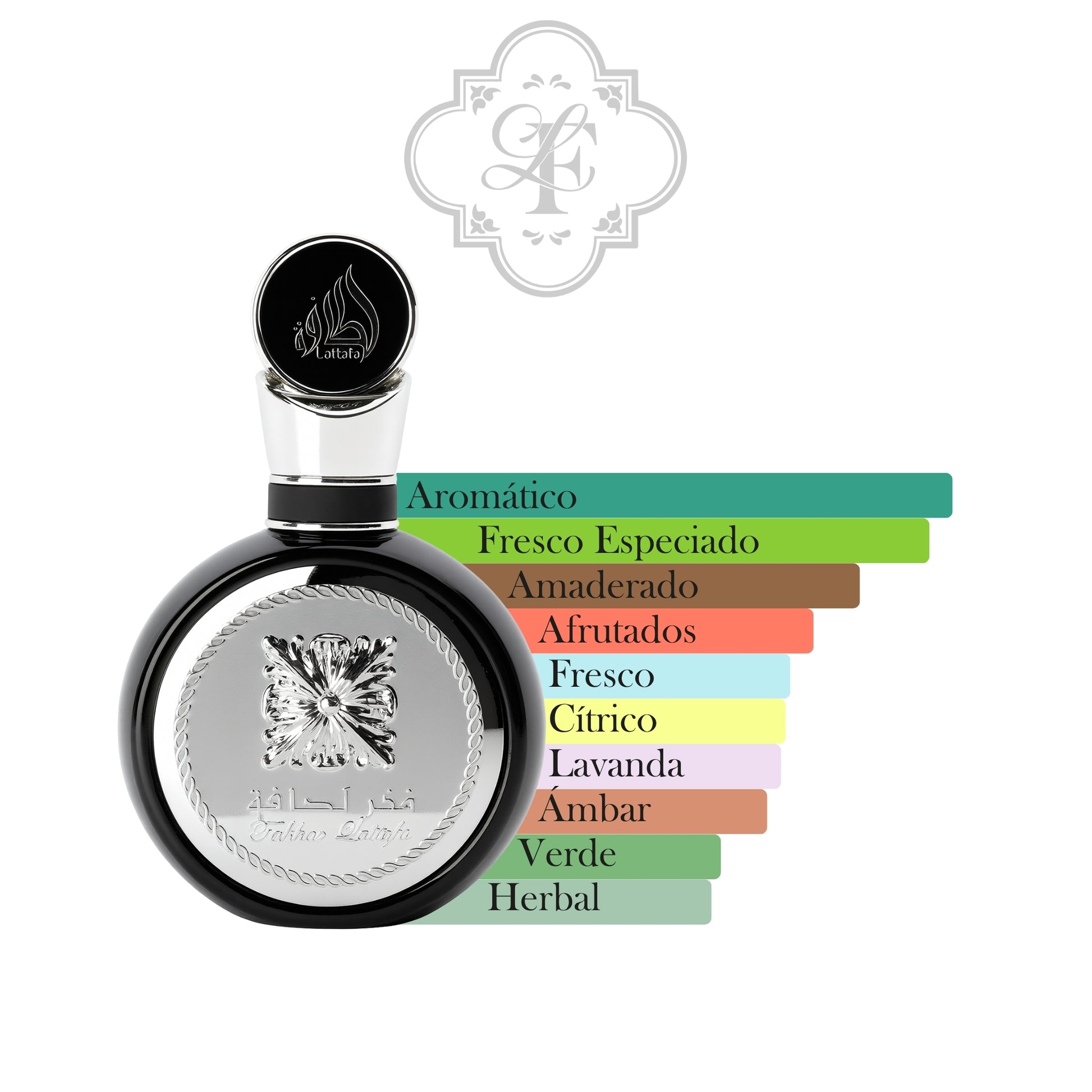 Fakhar Black de Lattafa Perfumes es una fragancia de la familia olfativa Oriental para Hombres. Esta fragrancia es nueva. Fakhar Black se lanzó en 2022. Las Notas de Salida son manzana, bergamota y jengibre; las Notas de Corazón son lavanda, salvia, bayas de enebro y geranio; las Notas de Fondo son haba tonka, cedro, Amberwood y vetiver.