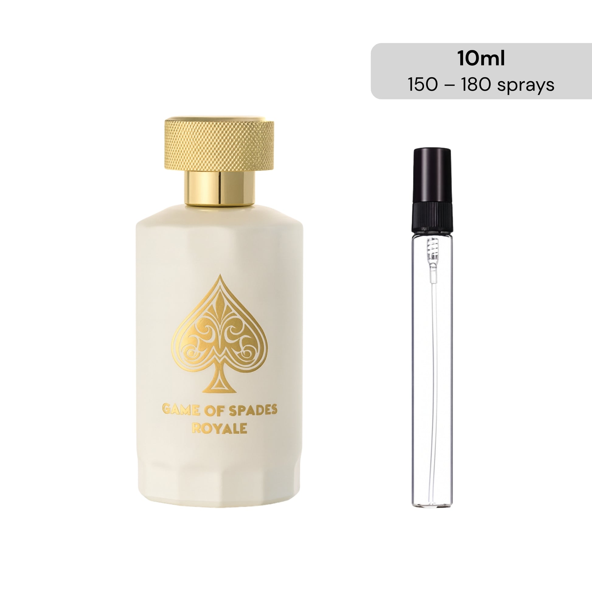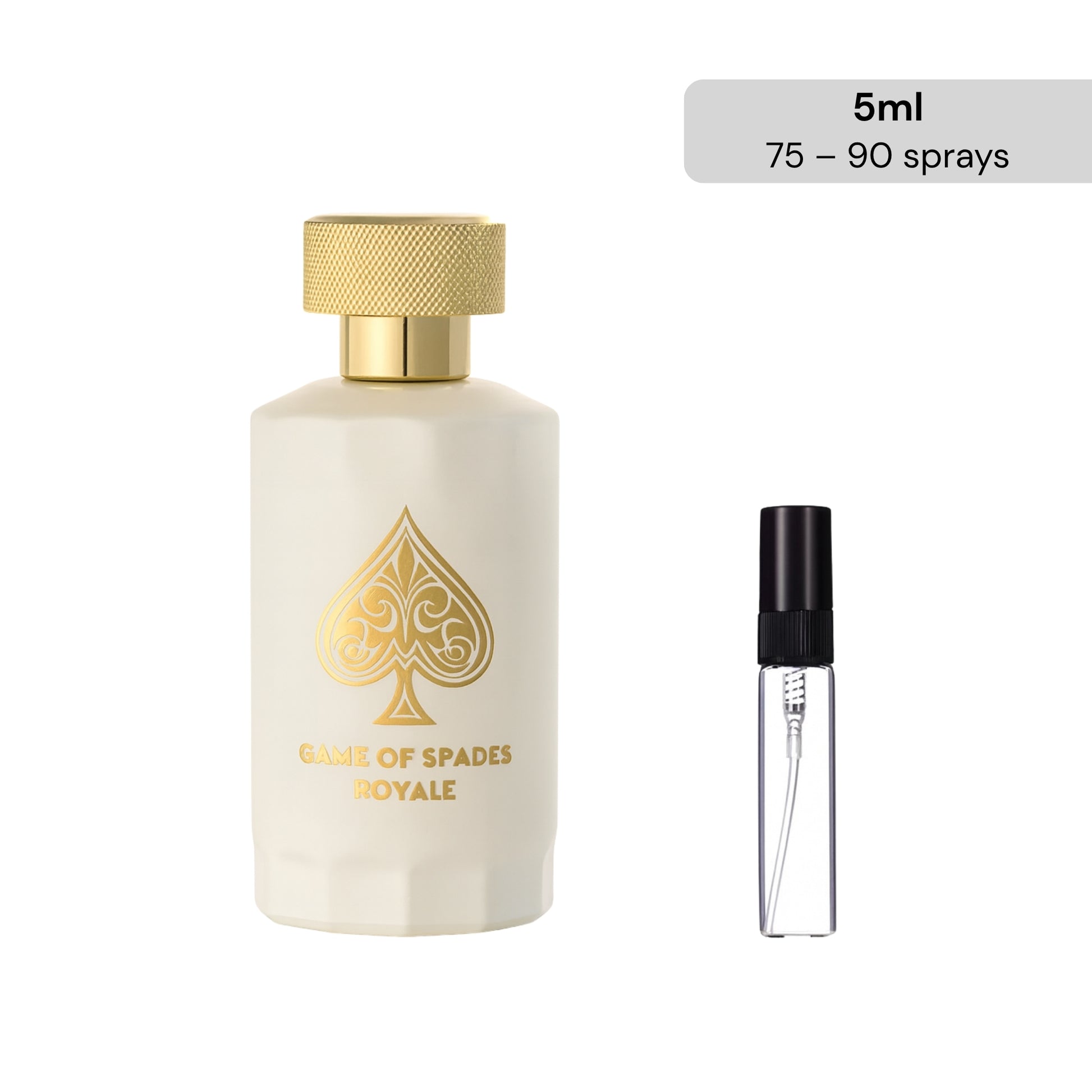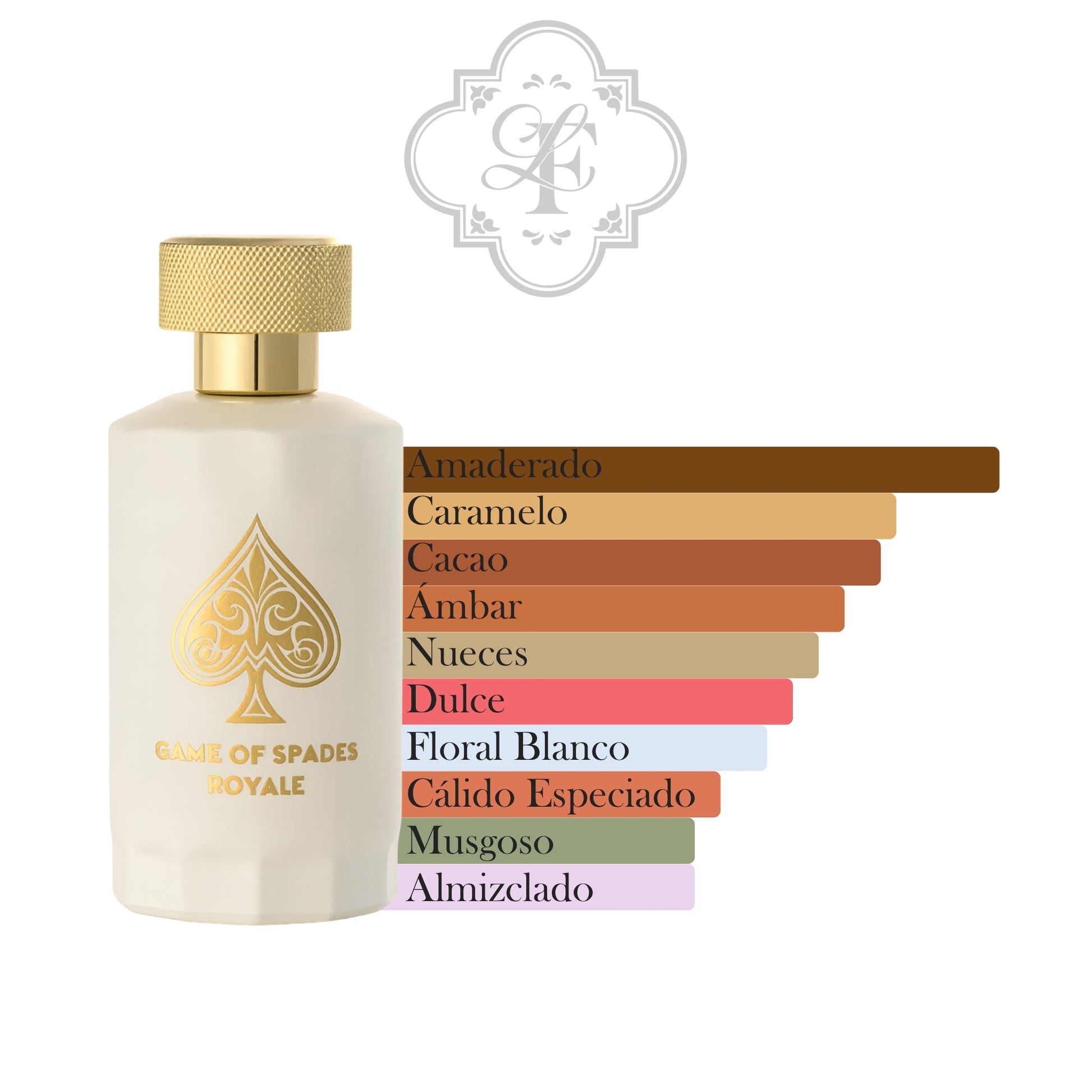 Game of Spades Royale de Jo Milano Paris es una fragancia de la familia olfativa para Hombres y Mujeres. Las Notas de Salida son cacao y avellana; las Notas de Corazón son jazmín sambac (sampaguita) y cedro; las Notas de Fondo son caramelo, ambroxan y musgo.