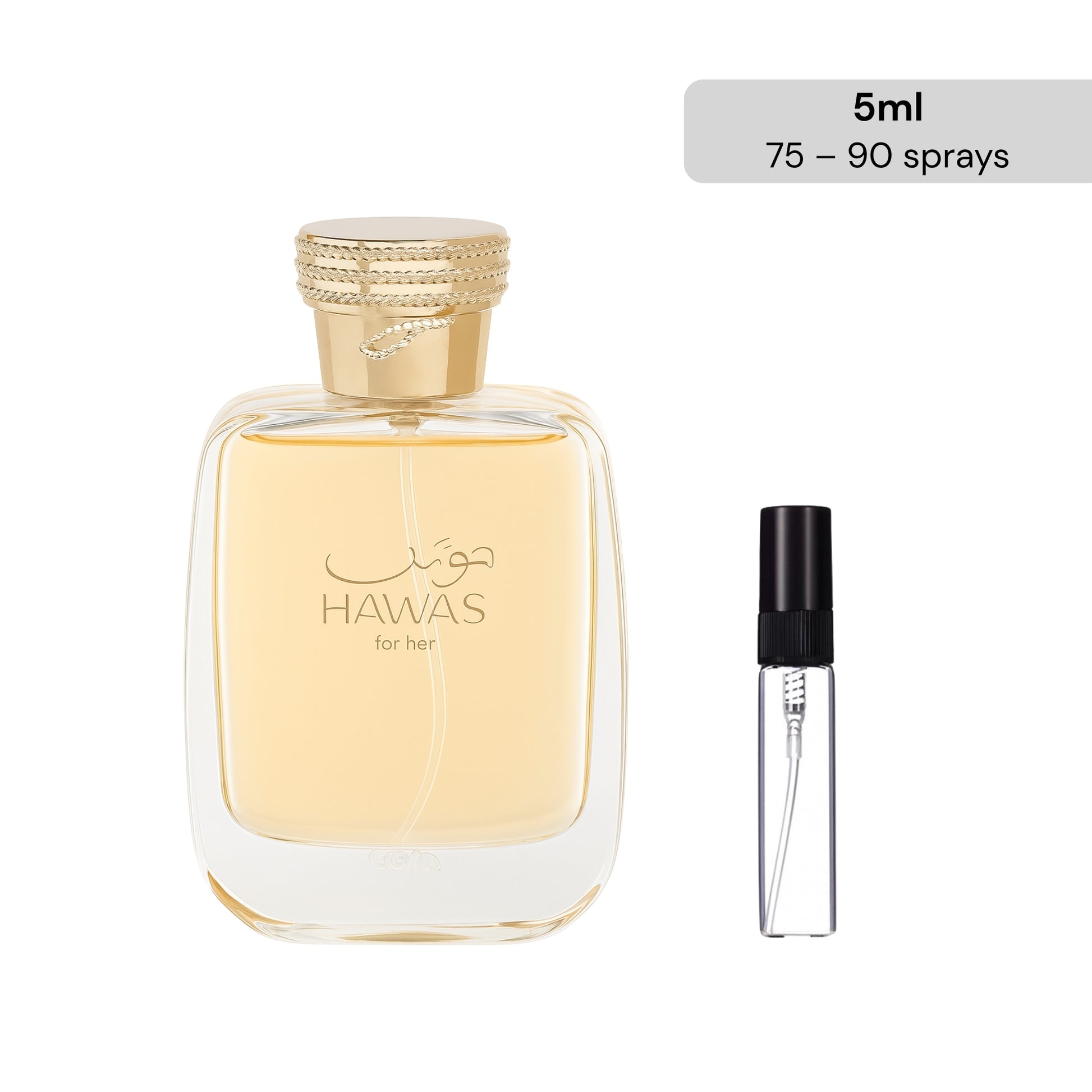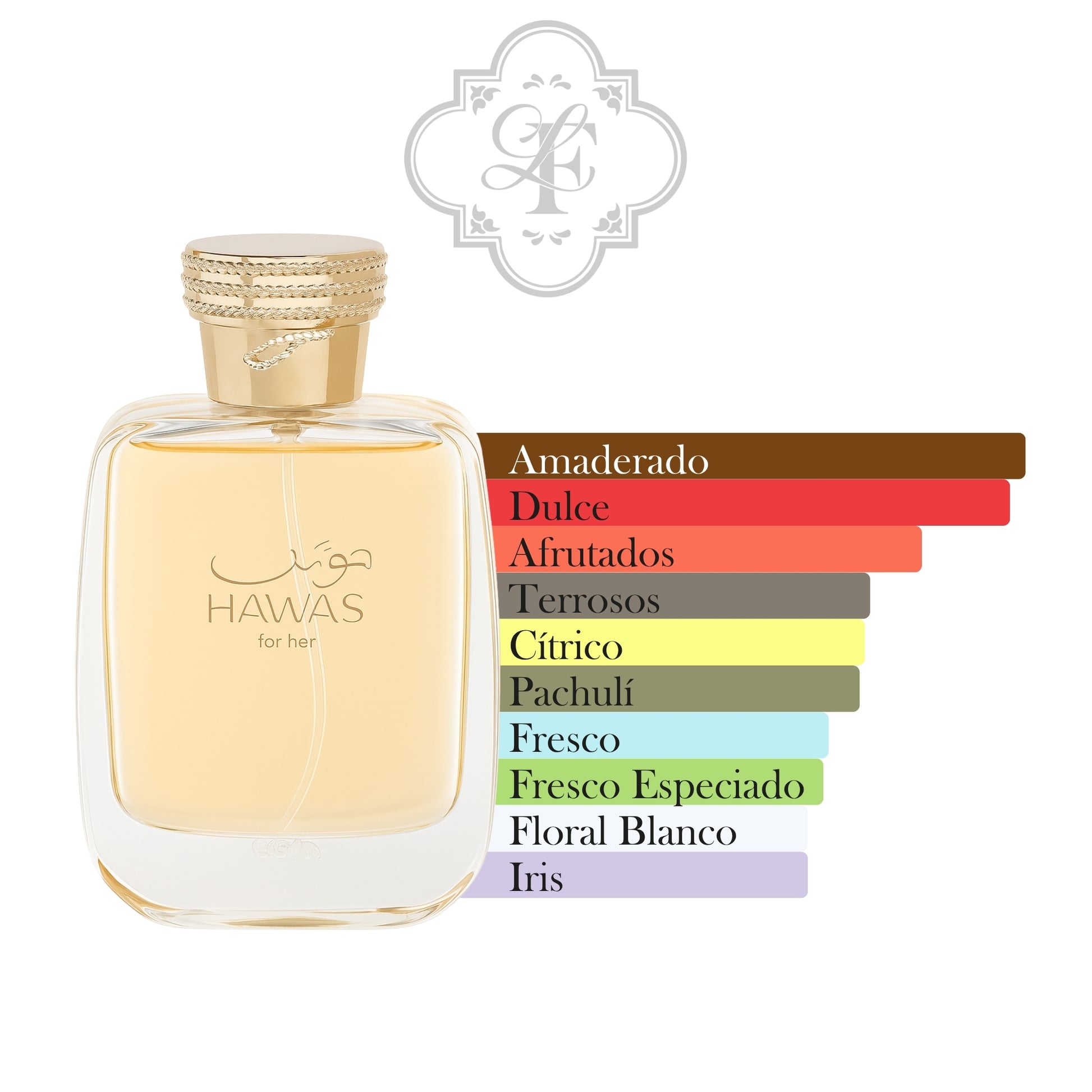 Hawas for Her de Rasasi es una fragancia de la familia olfativa Floral para Mujeres. Hawas for Her se lanzó en 2015. Las Notas de Salida son granada, manzana y toronja (pomelo); las Notas de Corazón son jazmín sambac (sampaguita), iris y cítricos; las Notas de Fondo son praliné, pachulí y vetiver.