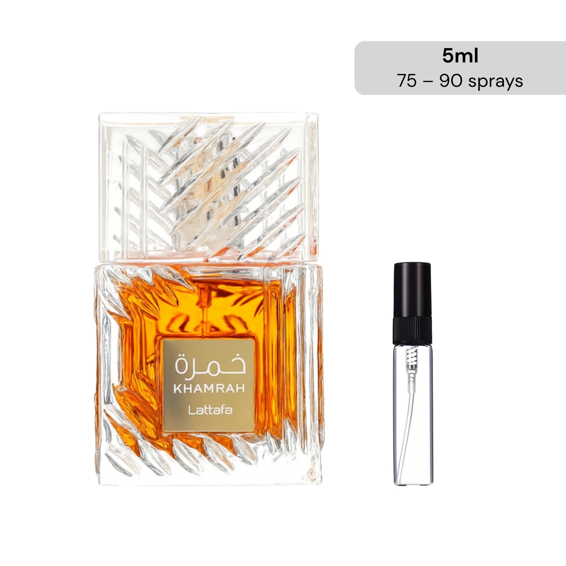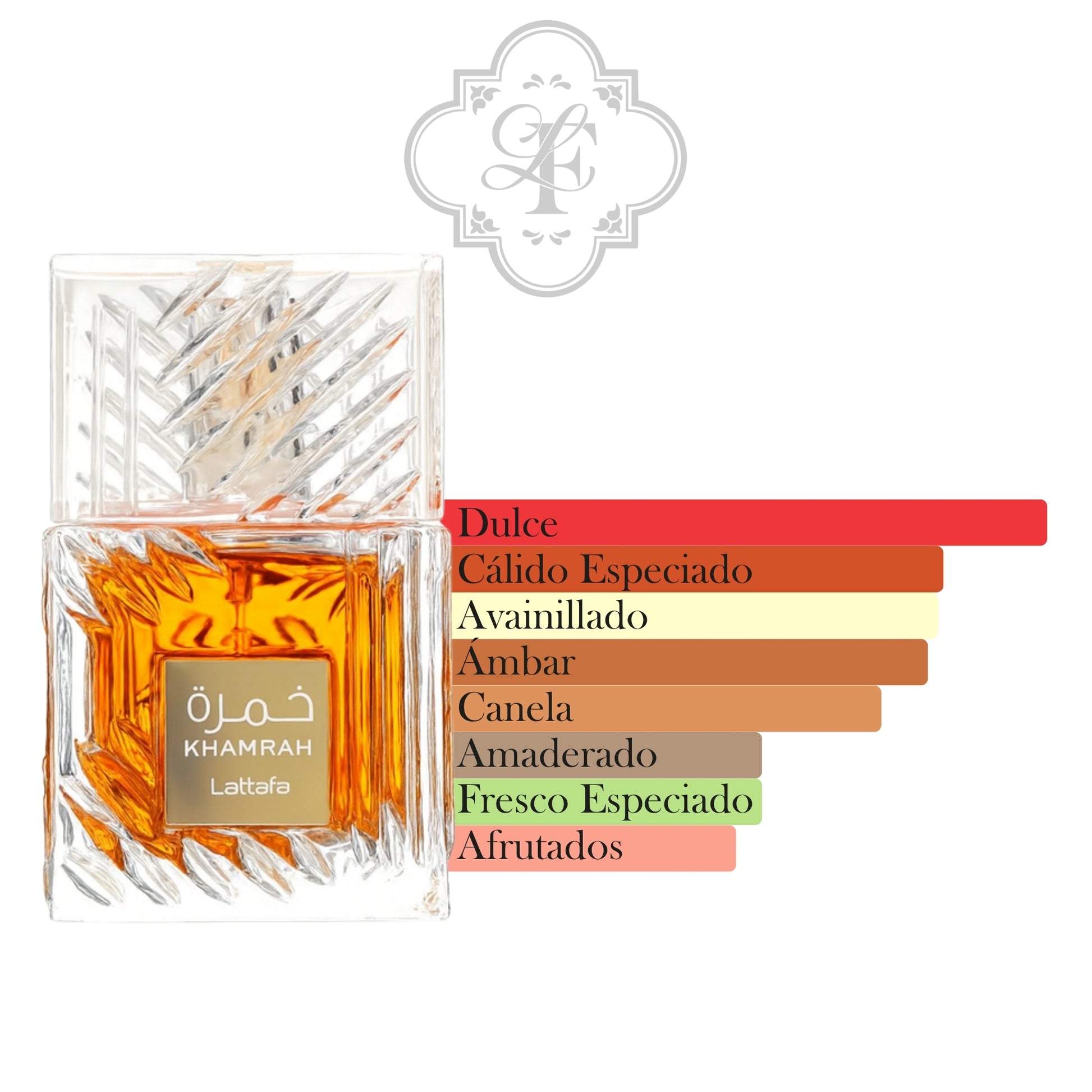 Khamrah de Lattafa Perfumes es una fragancia de la familia olfativa Oriental Especiada para Hombres y Mujeres. Khamrah se lanzó en 2022. Las Notas de Salida son canela, nuez moscada y bergamota; las Notas de Corazón son dátiles, praliné, nardos y Mahonial; las Notas de Fondo son vainilla, haba tonka, Amberwood, mirra, benjuí y Akigalawood.