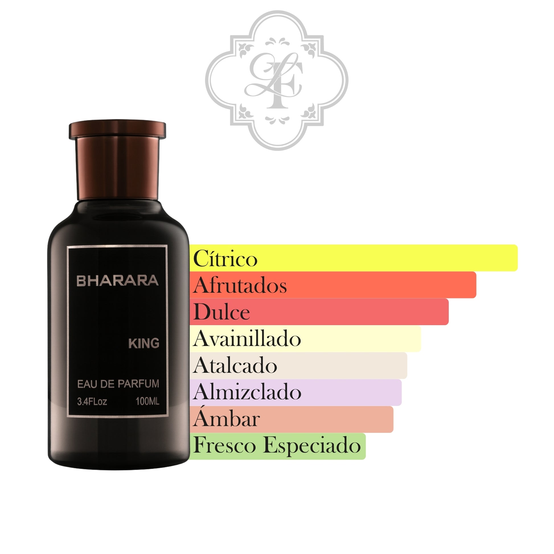 King de Bharara es una fragancia de la familia olfativa Aromática para Hombres. King se lanzó en 2021. Las Notas de Salida son naranja, bergamota y limón (lima ácida); la Nota de Corazón es notas afrutadas; las Notas de Fondo son vainilla, almizcle blanco y ámbar.