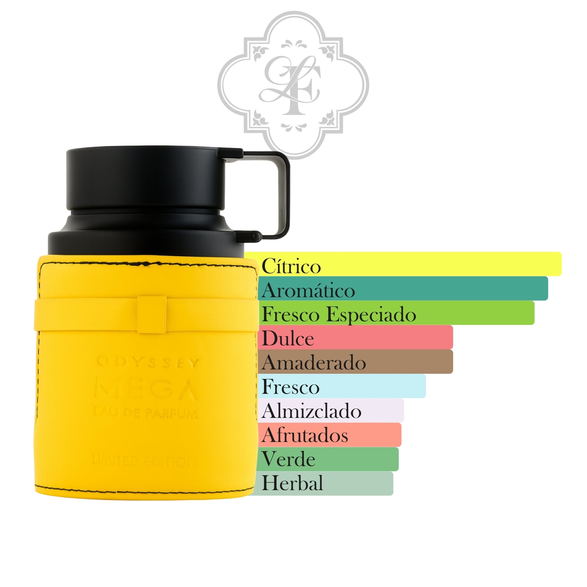 Odyssey Mega Man de Armaf es una fragancia de la familia olfativa Amaderada Aromática para Hombres. Odyssey Mega Man se lanzó en 2023. Las Notas de Salida son naranja, bergamota, limón (lima ácida), jengibre y menta; las Notas de Corazón son piña, enebro de Virginia, salvia y geranio; las Notas de Fondo son almizcle, haba tonka, cedro y vetiver.
