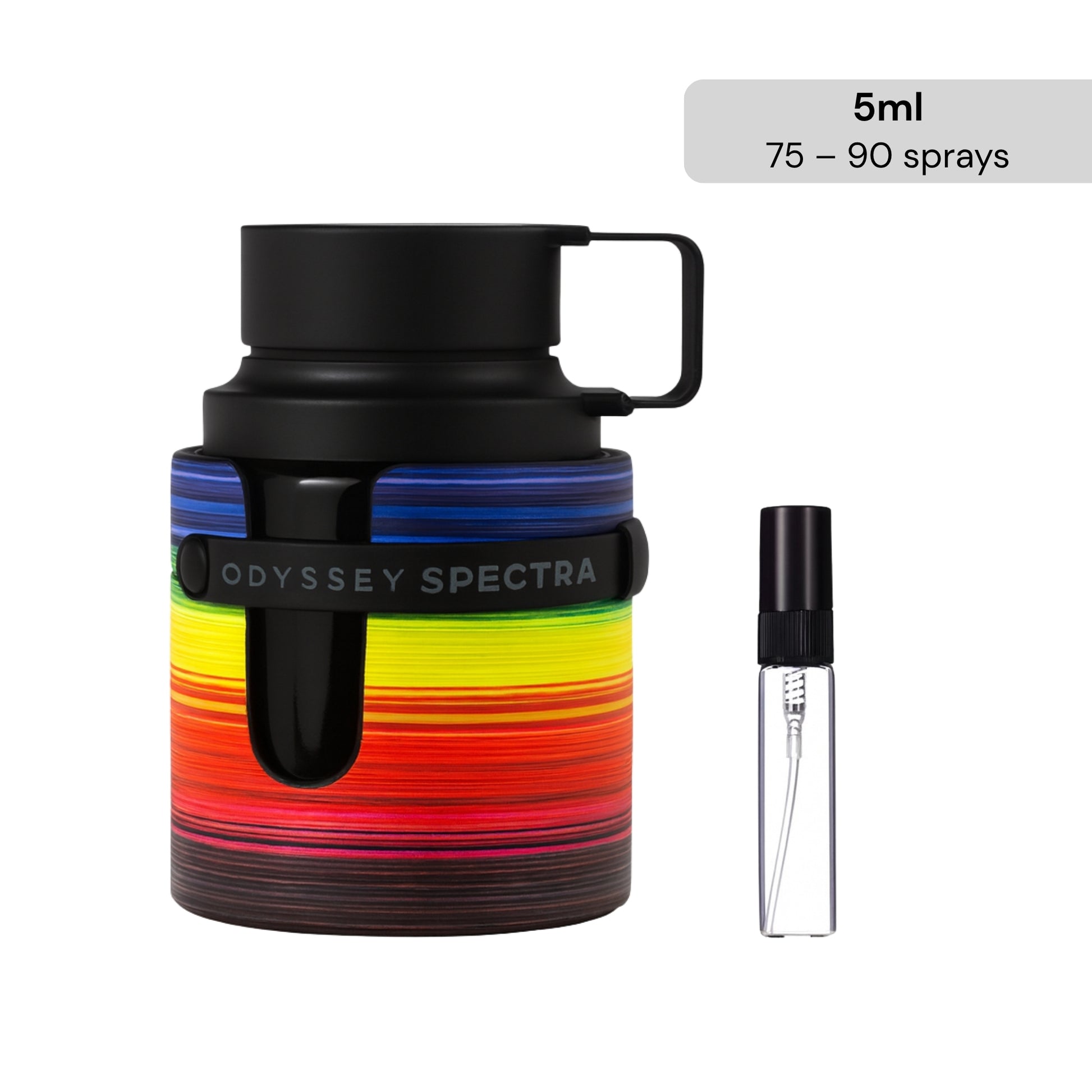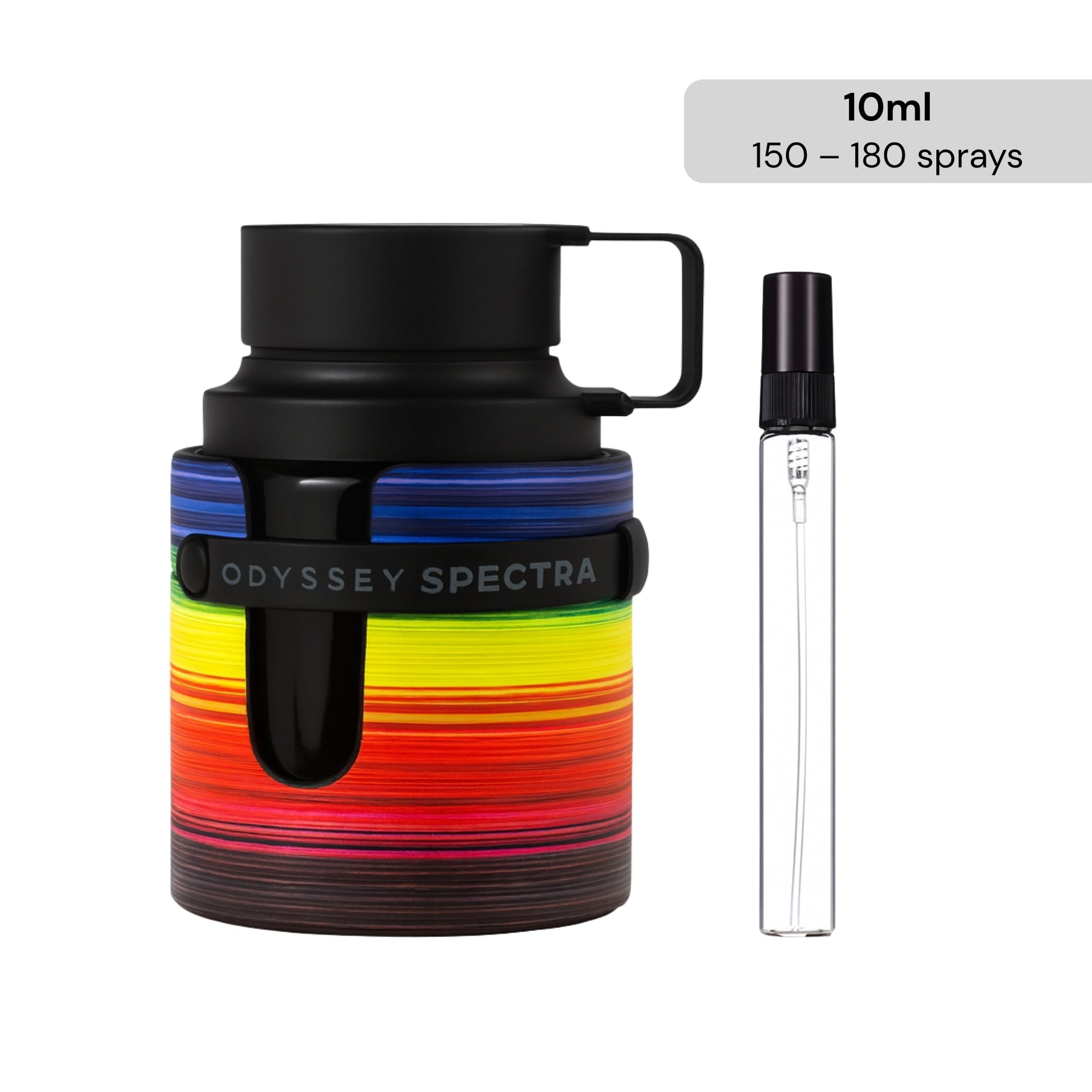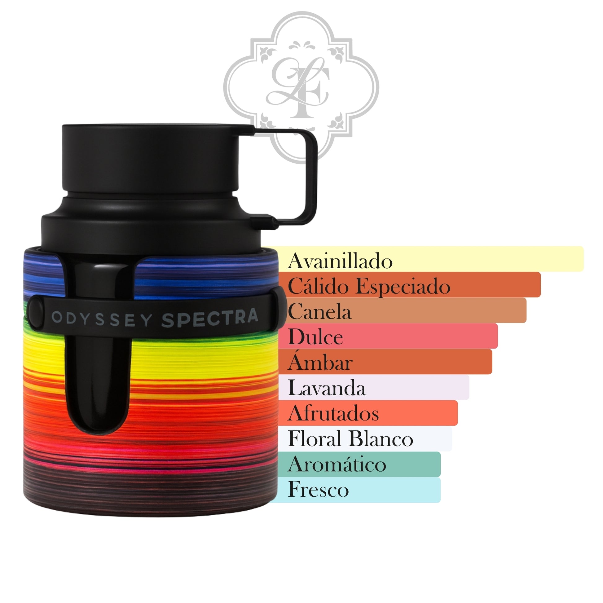 Odyssey Spectra de Armaf es una fragancia de la familia olfativa Oriental Especiada para Hombres y Mujeres. Esta fragrancia es nueva. Odyssey Spectra se lanzó en 2024. Las Notas de Salida son canela, manzana y bergamota; las Notas de Corazón son canela, lavanda, flor de azahar del naranjo y lirio de los valles (muguete); las Notas de Fondo son vainilla, haba tonka, tabaco, ámbar y pachulí.