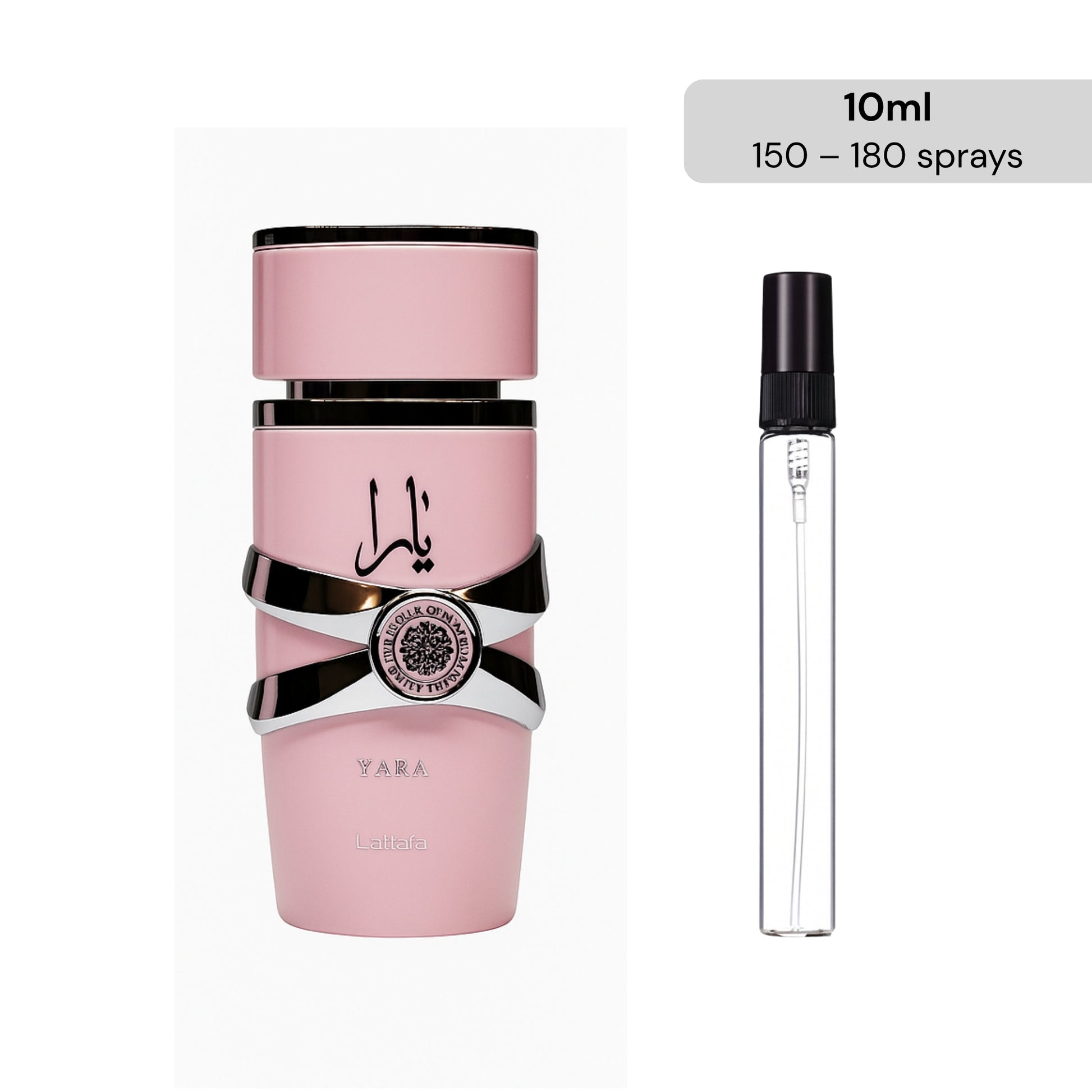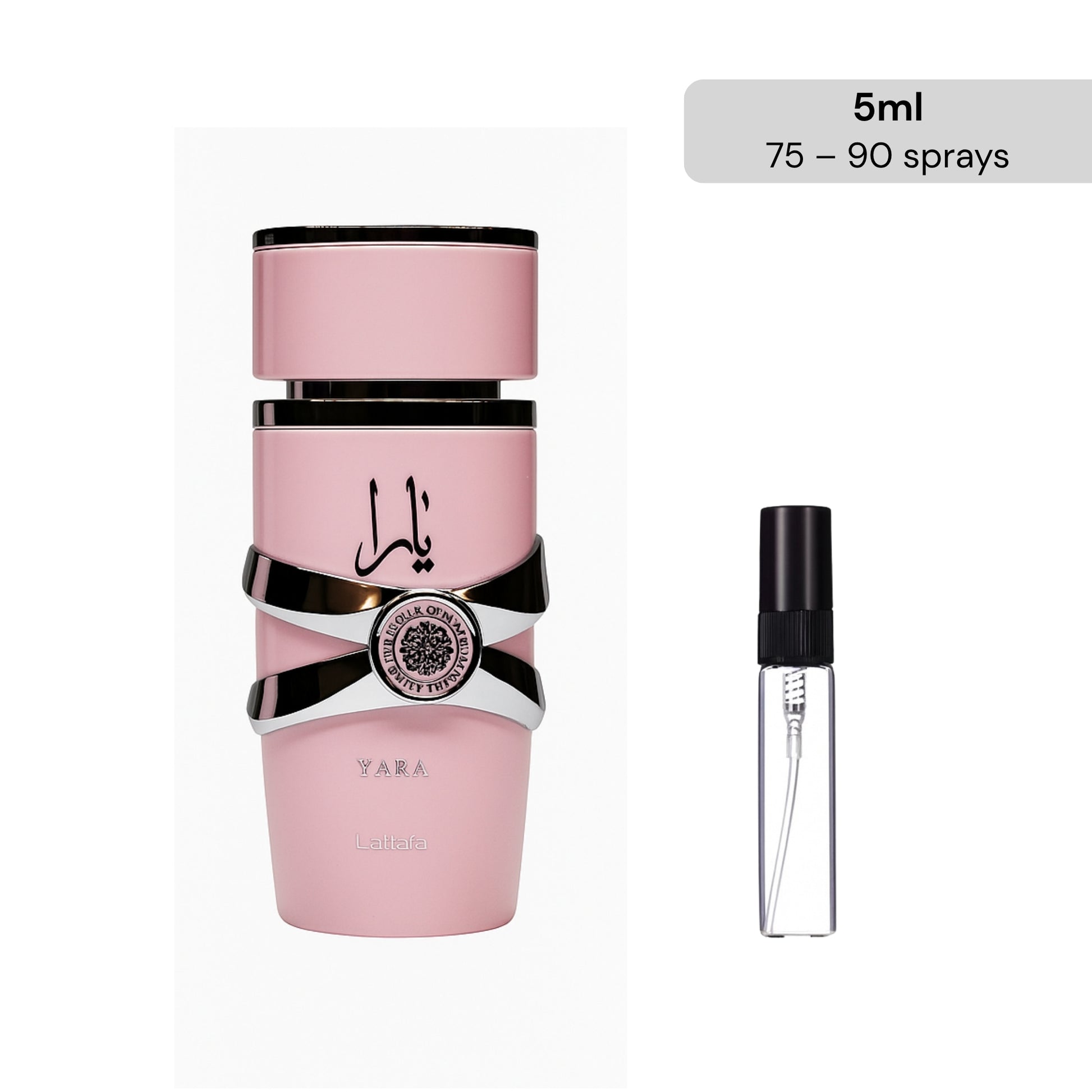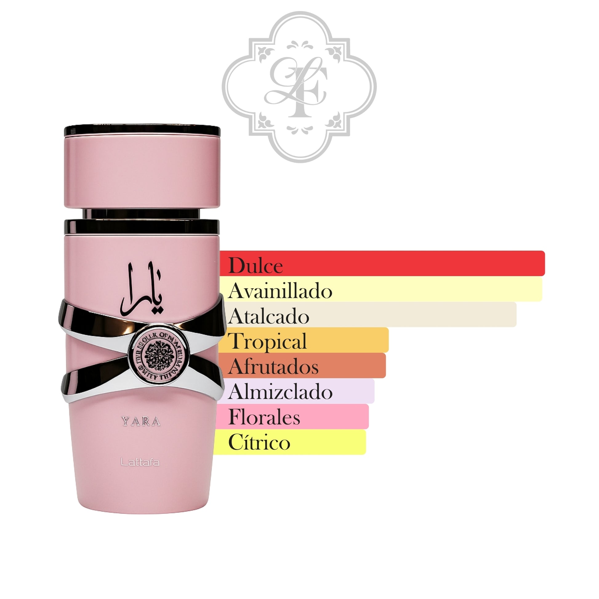 Yara de Lattafa Perfumes es una fragancia de la familia olfativa Oriental Vainilla para Mujeres. Yara se lanzó en 2020. Las Notas de Salida son orquídea, heliotropo y naranja tangerina; las Notas de Corazón son Acuerdo goloso y frutas tropicales; las Notas de Fondo son vainilla, almizcle y sándalo.