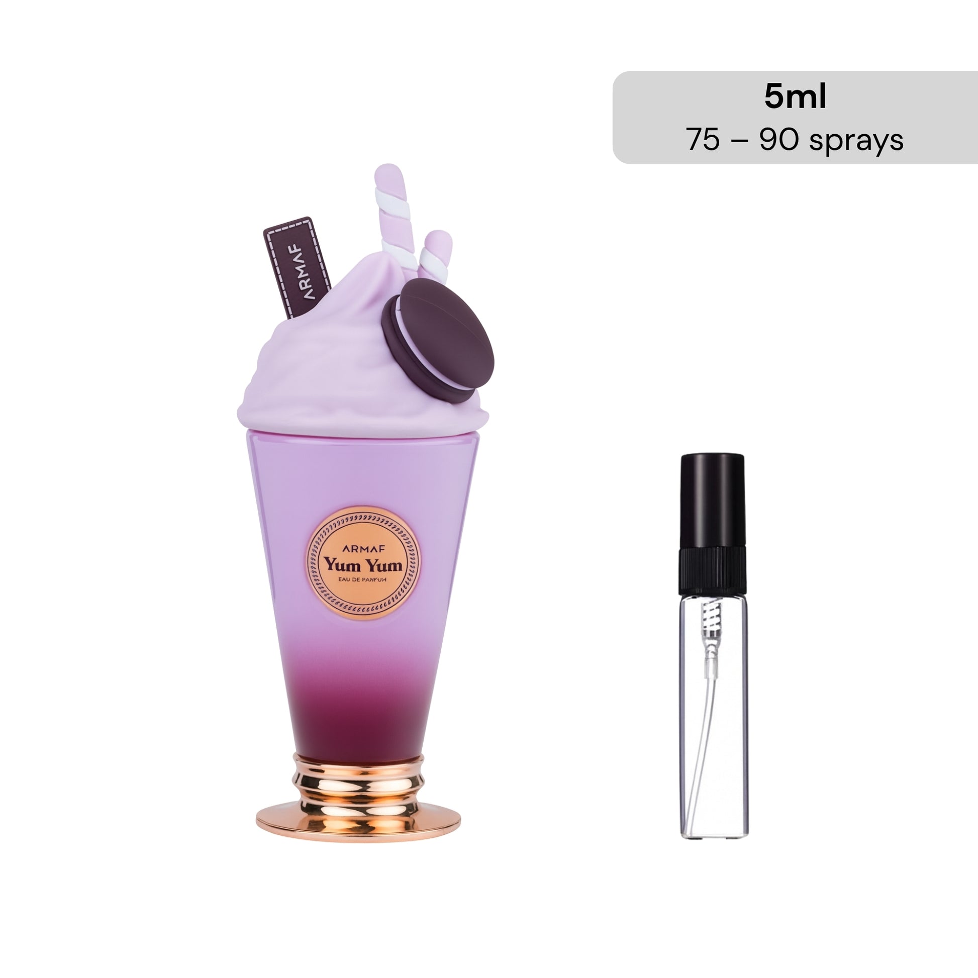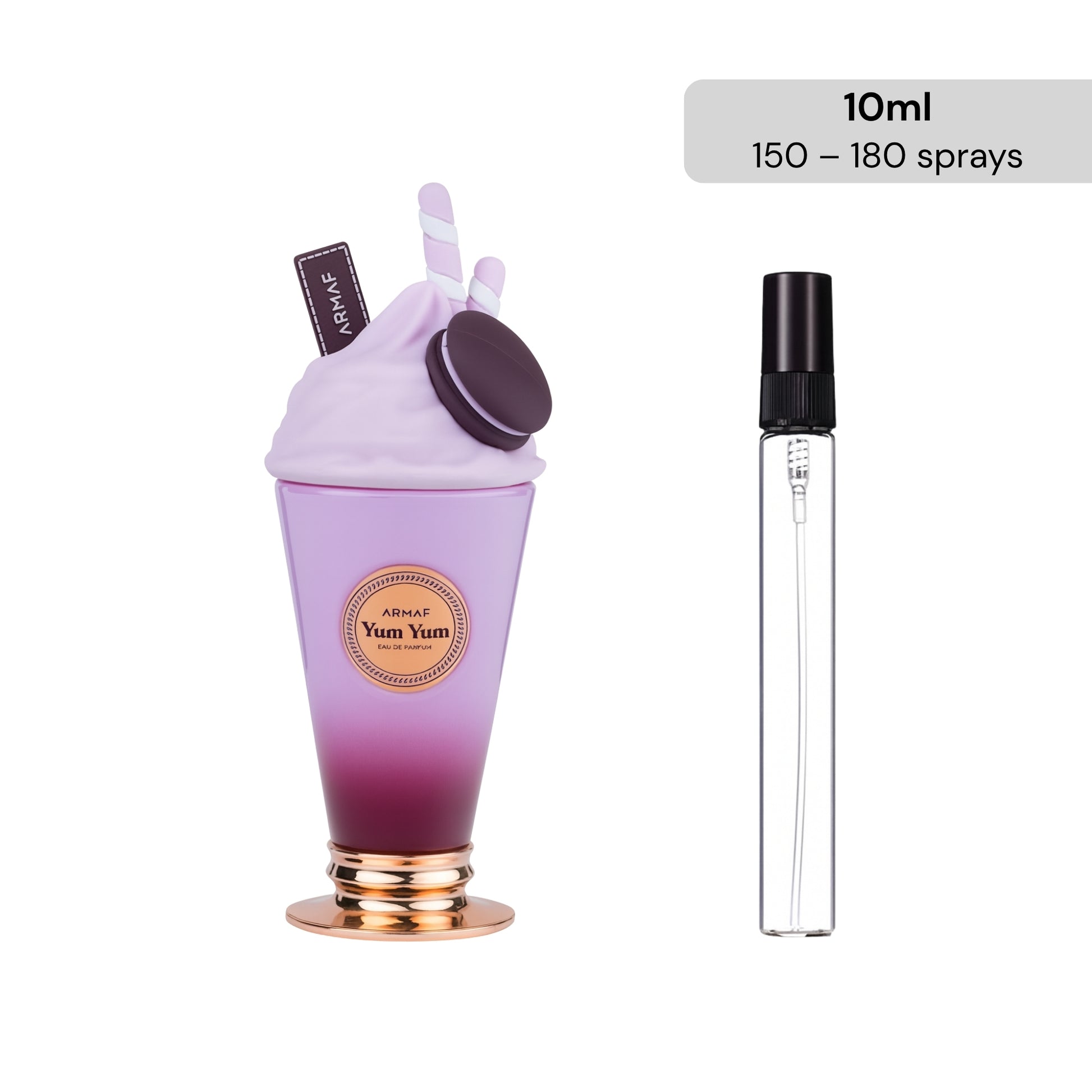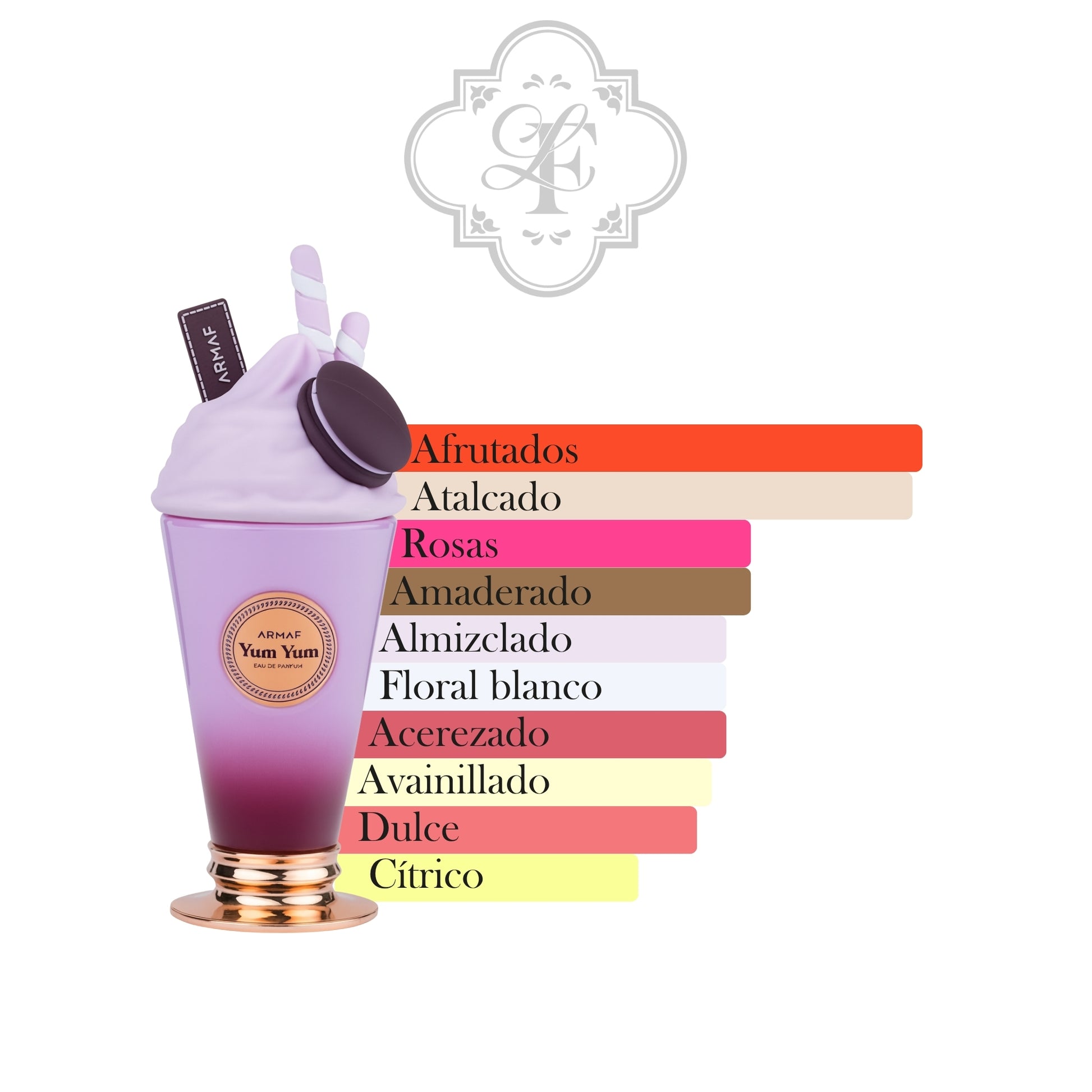 Yum Yum de Armaf es una fragancia de la familia olfativa Floral Frutal para Mujeres. Esta fragrancia es nueva. Yum Yum se lanzó en 2024. Las Notas de Salida son bayas silvestres, cereza, naranja y bergamota; las Notas de Corazón son rosa, flores blancas y vainilla; las Notas de Fondo son notas atalcadas, almizcle y ámbar.